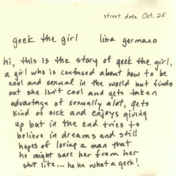 If “Riding My Bike” was about paranoia and fear, Geek the Girl expands on those themes with the feelings of wanting affection, and being both disgusted, and attracted, to the violent, jealous forms it sometimes takes. It’s about toxic love personally, and more generally, a near suffocating pessimism with mankind. The subject matter is personal, but it’s also political. It’s the same kind of third-wave, middle finger feminism that the riot grrrls were screaming about. The music might not be as loud as those punk rock bands, but it’s no less angry. As Germano writes at the end of the liner notes for the album, her mantra is clear: