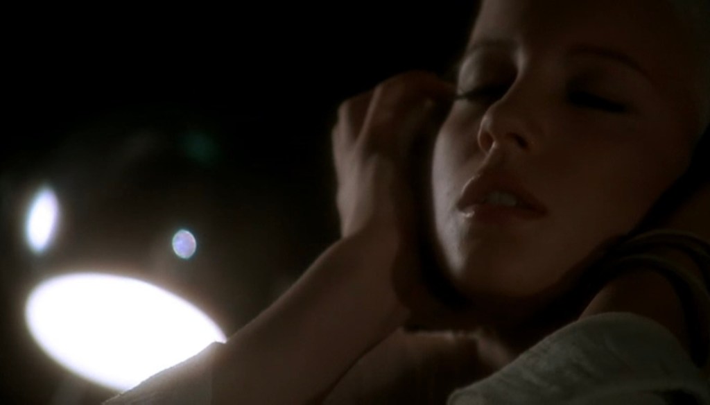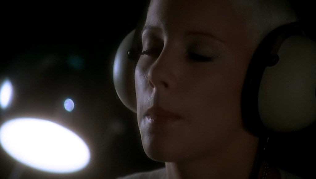 “As Ingrid continued, a movement Laure made diverted my attention from the slides: she took a large pair of headphones which were on the shelf in front of her and placed them on her head. She kept her hands flat upon the outside of the pads as if wishing to press them more tightly against her ears. Elbows slightly bent, nape a little inclined, in the attitude of one suffering an unbearable headache, suppressing a cry. At the same time she closed her eyelids and her lips parted.”