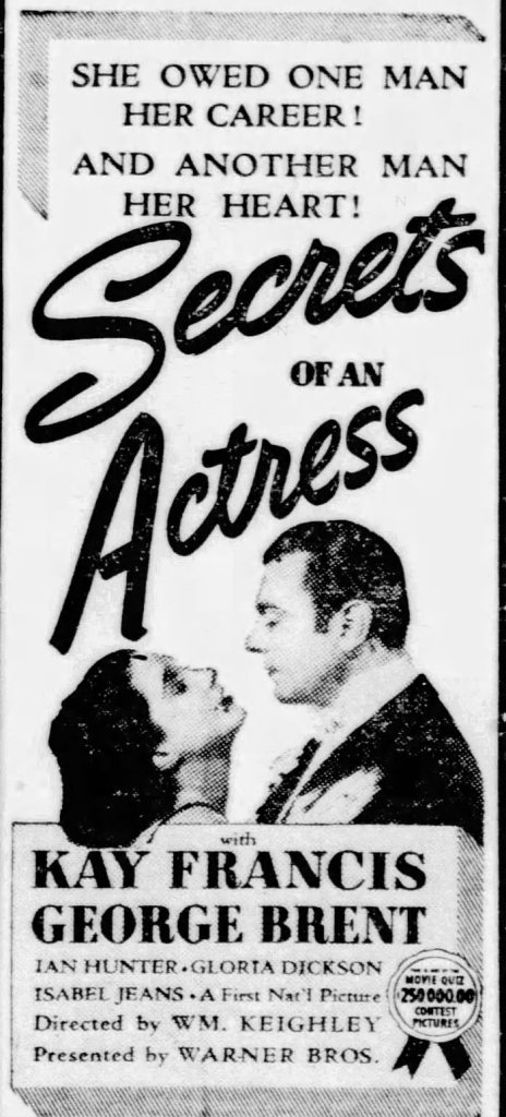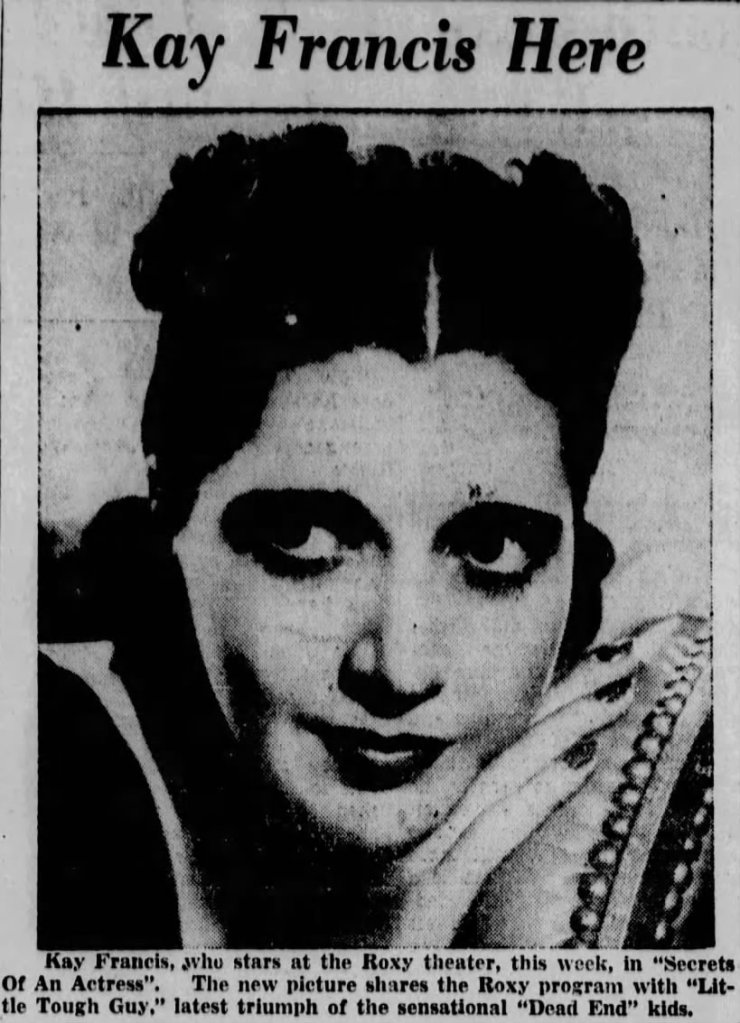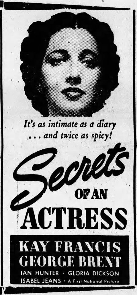 Under the headline “Kay Francis Gets a Bad Break Again,” Glenn C. Pullen at The Plain Dealer wrote about Kay’s follow-up, Secrets of An Actress: