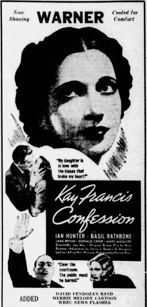 The film itself won’t change your life, but it won’t make you want to claw your eyes out either (see: My Bill). The three veterans, Francis, Brent and Ian Hunter, go through the motions, playing out what Richard G. Moffett at The Florida Times-Union described as “very poor material…a plot that has been worked over many times.”10 Maybe the glut of Francis films hitting the big screen that year had him feeling as tired as our cracked actress, going on to specifically call out Kay’s habit of “entwining her fingers and folding her arms, both stock mannerisms which are featured in nearly all of her pictures.”11